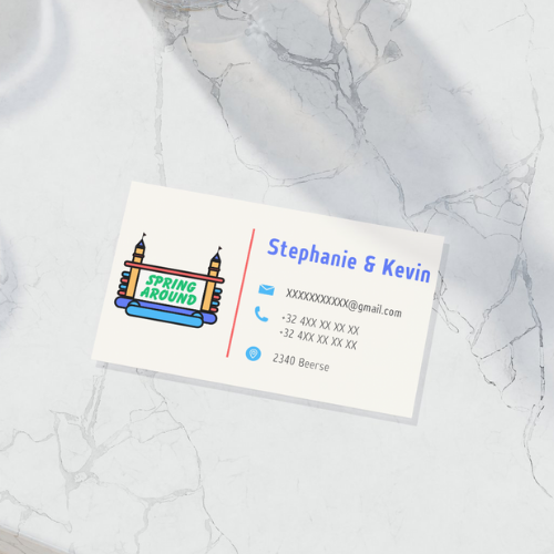 Voor Spring Around, de nieuwe springkastelenverhuur van Kevin, mocht ik aan de slag met een vrolijk logo en bijpassende visitekaartjes. Kevin zocht iets speels en opvallends om mee te geven aan klanten. Ik koos bewust voor felle kleuren die meteen een vrolijk en energiek gevoel oproepen – helemaal in lijn met de beleving van springkastelen. Het resultaat? Een frisse, herkenbare uitstraling die perfect past bij zijn jonge onderneming.